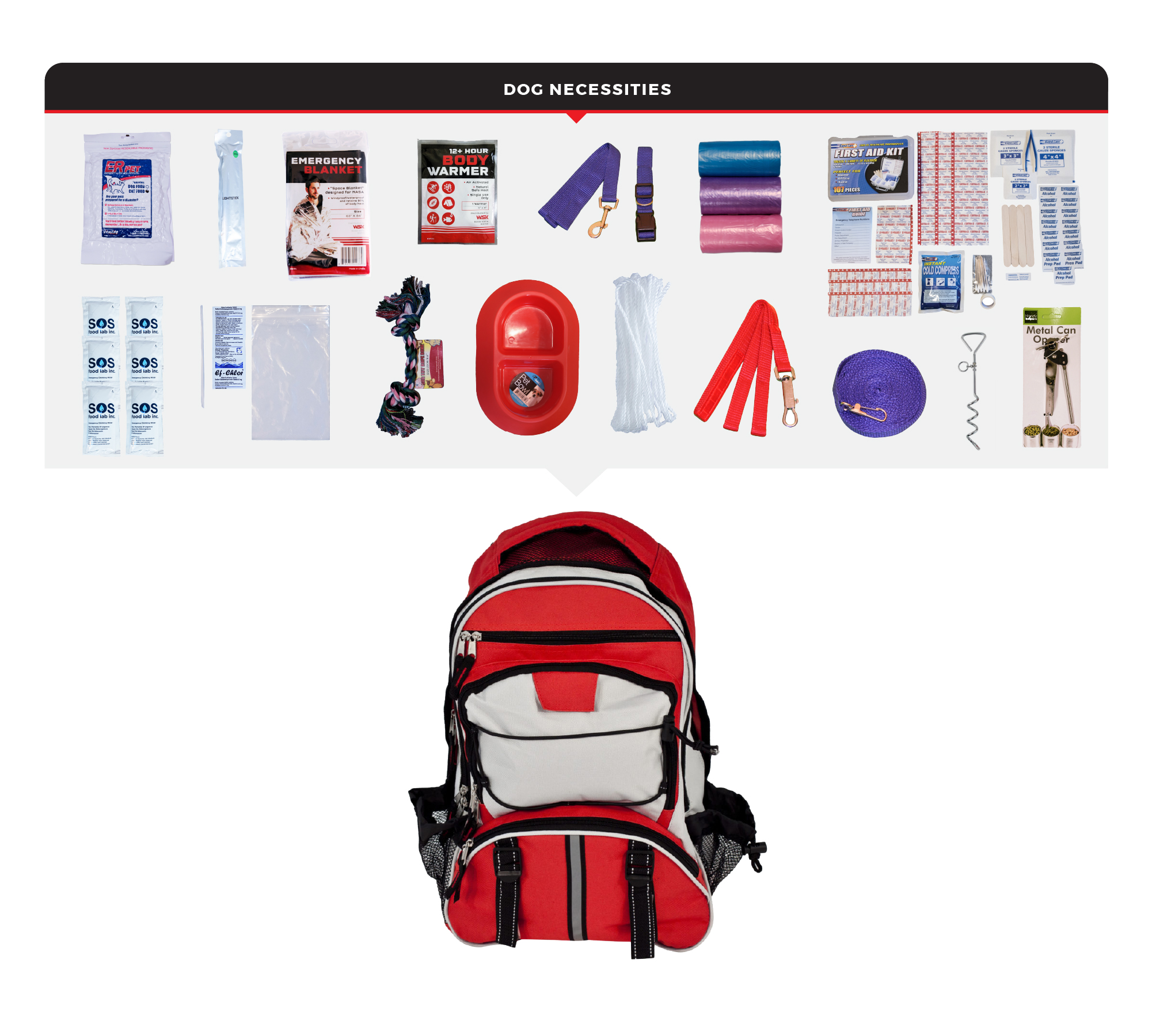 This Dog Survival Kit has been designed to provide your pet with all of the necessary items to survive if you are ever forced to evacuate. By purchasing this survival kit, you will have peace of mind knowing that your dog will be safe and comfortable in any type of disaster. Hand-assembled in the USA.