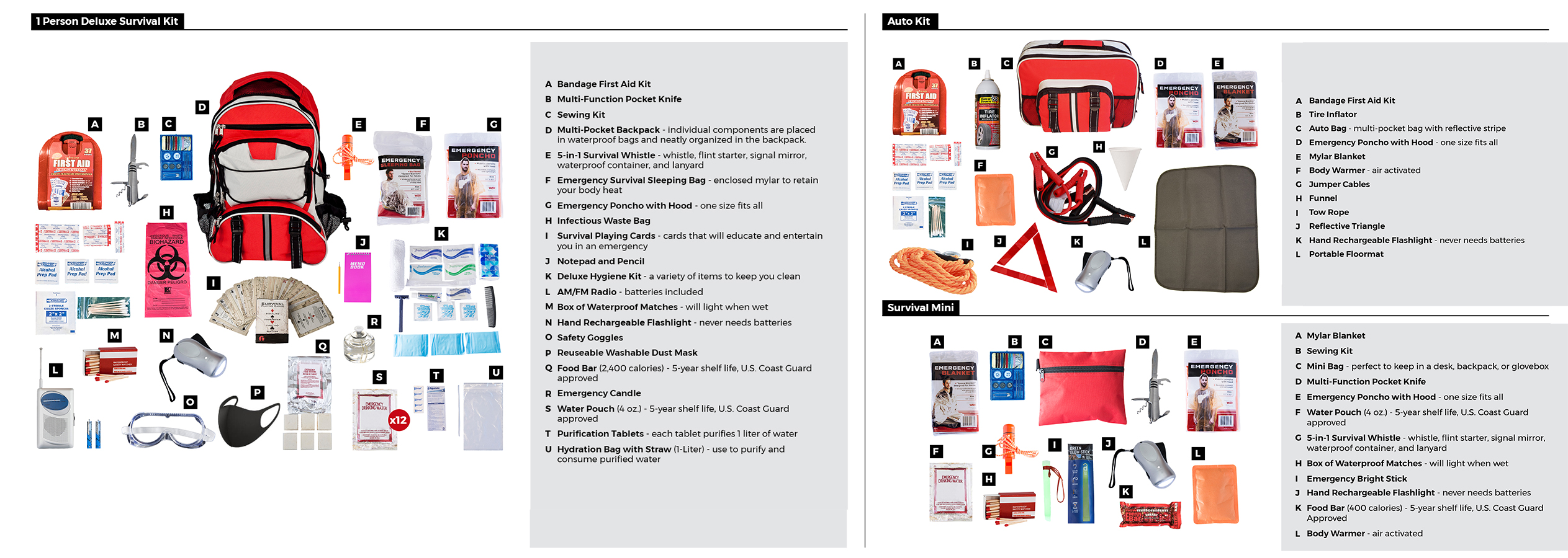 - (1) 1-Liter Hydration Bag with Straw*This kit provides 1 gallon of water per person per day for drinking and sanitation, as recommended by FEMA.